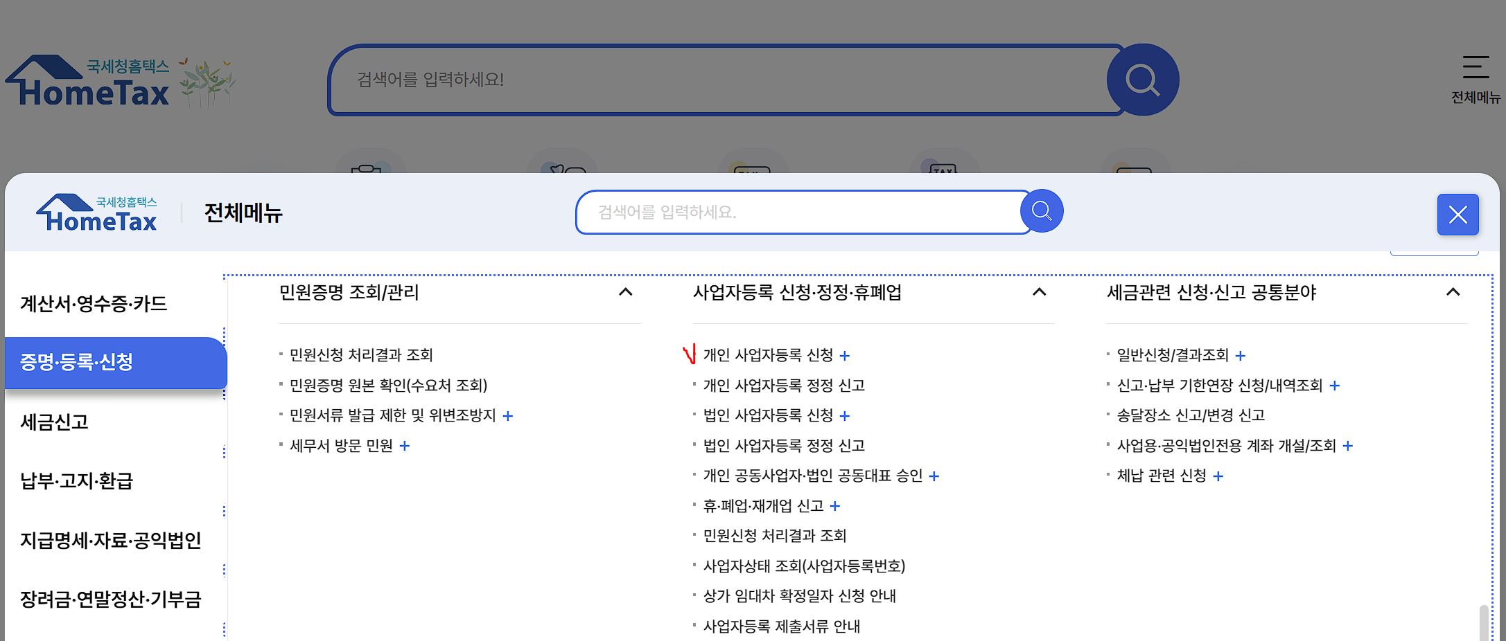 홈택스 로그인 → [민원증명] → [사업자등록 신청]