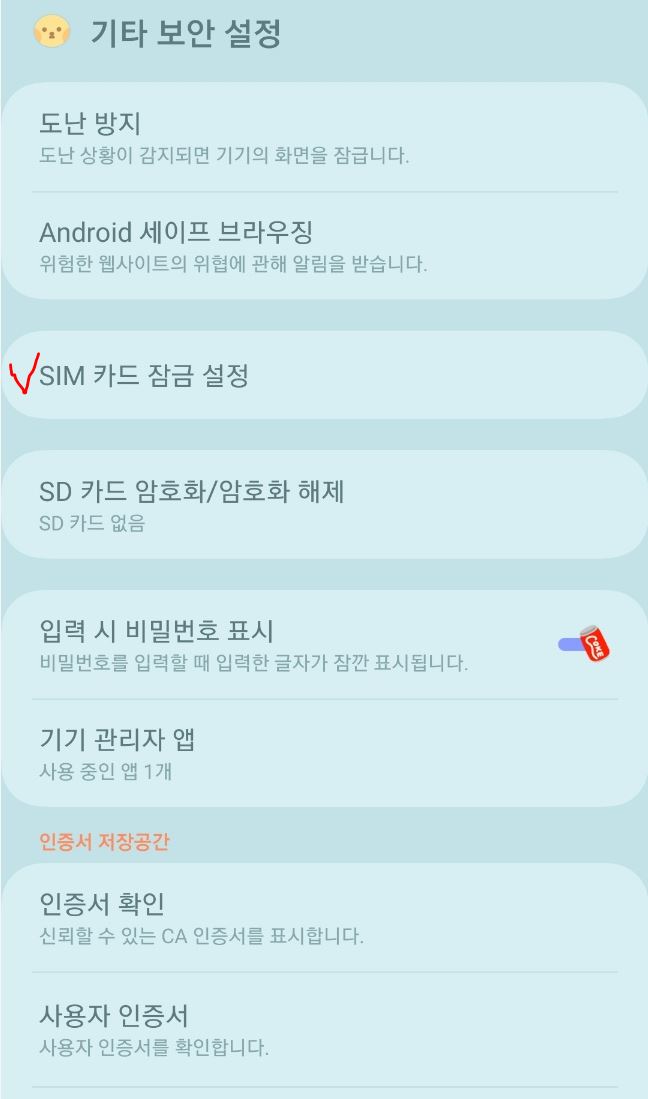 ☞ 설정 메뉴는 휴대폰마다 다를 수 있습니다. 메뉴를 찾지 못한다면 설정에서 찾기(돋보기)를 누른 후 'sim' 검색 후 설정을 하시면 됩니다.