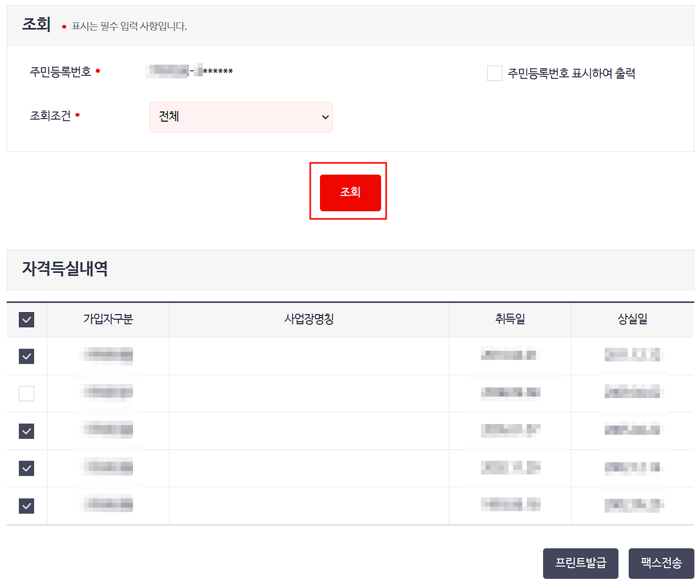 3. 조회 조건을 선택 하신 후 조회를 클릭하신 후 자격득실 내역을 확인하고 필요한 것만 체크하셔서 프린트 발급을 받으시길 바랍니다.