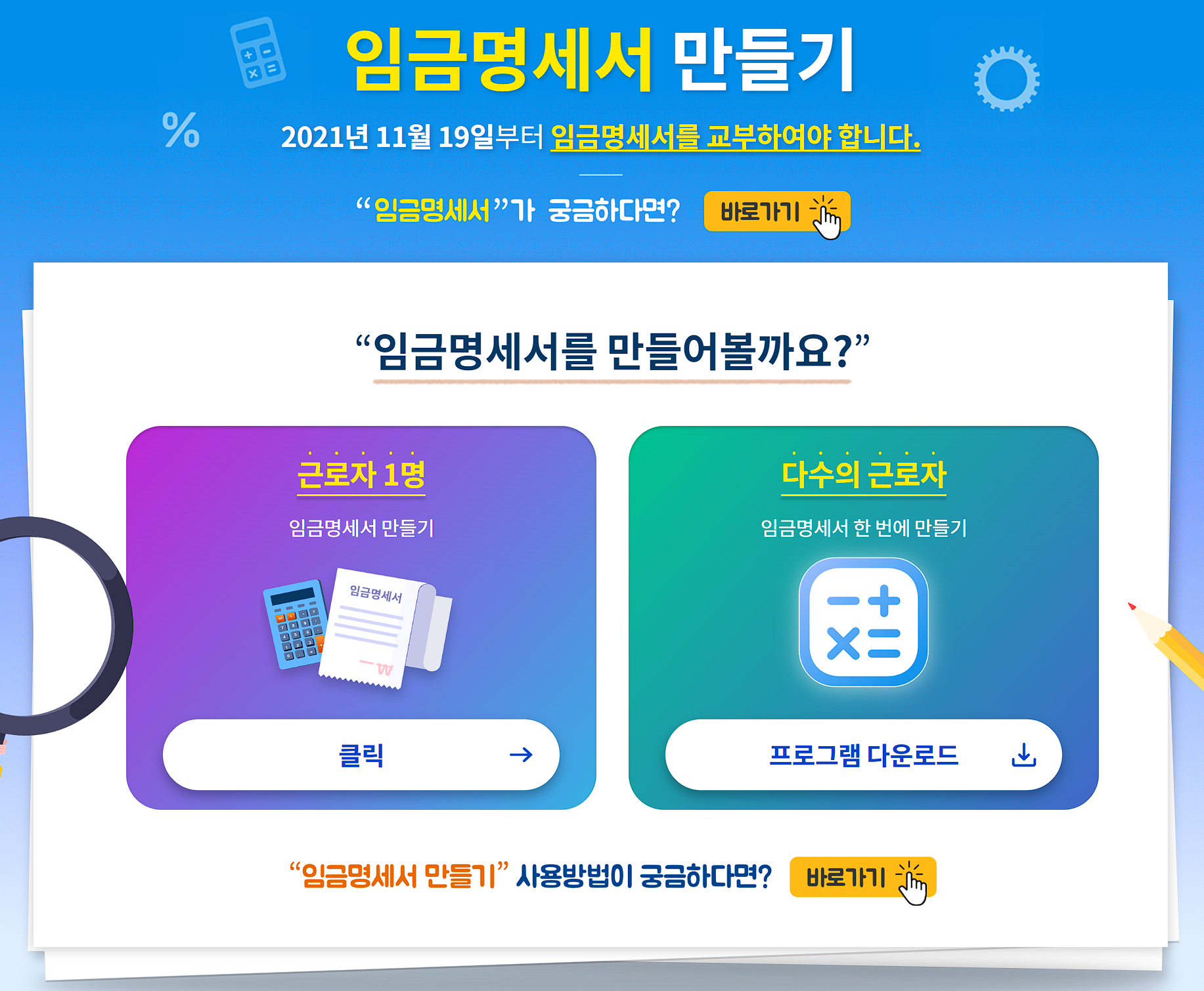 임금명세서 만들기는 근로자 1명에 대한 임금명세서를 하나씩 직접 작성하는 개별 작성법과 다수의 근로자의 임금명세서를 한번에 만들 수 있는 일괄작성 방식 중에 선택하여 이용하실 수 있습니다.