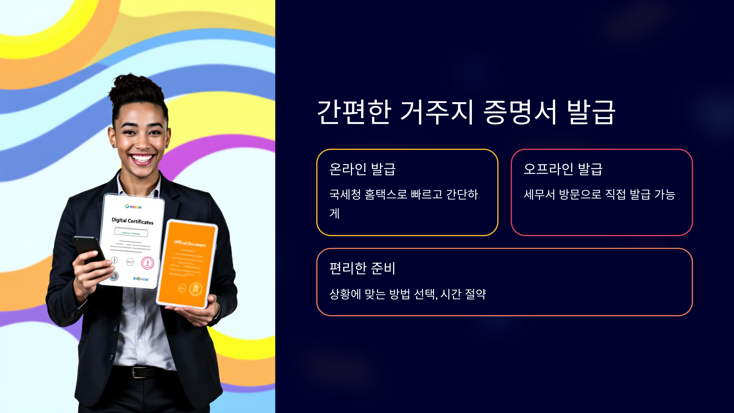 납세자 거주지 증명서는 국세청 홈태스를 통해 온라인으로 빠르고 간단하게 발급받을 수 있으며, 세무서를 방문해 오프라인 발급도 가능합니다.