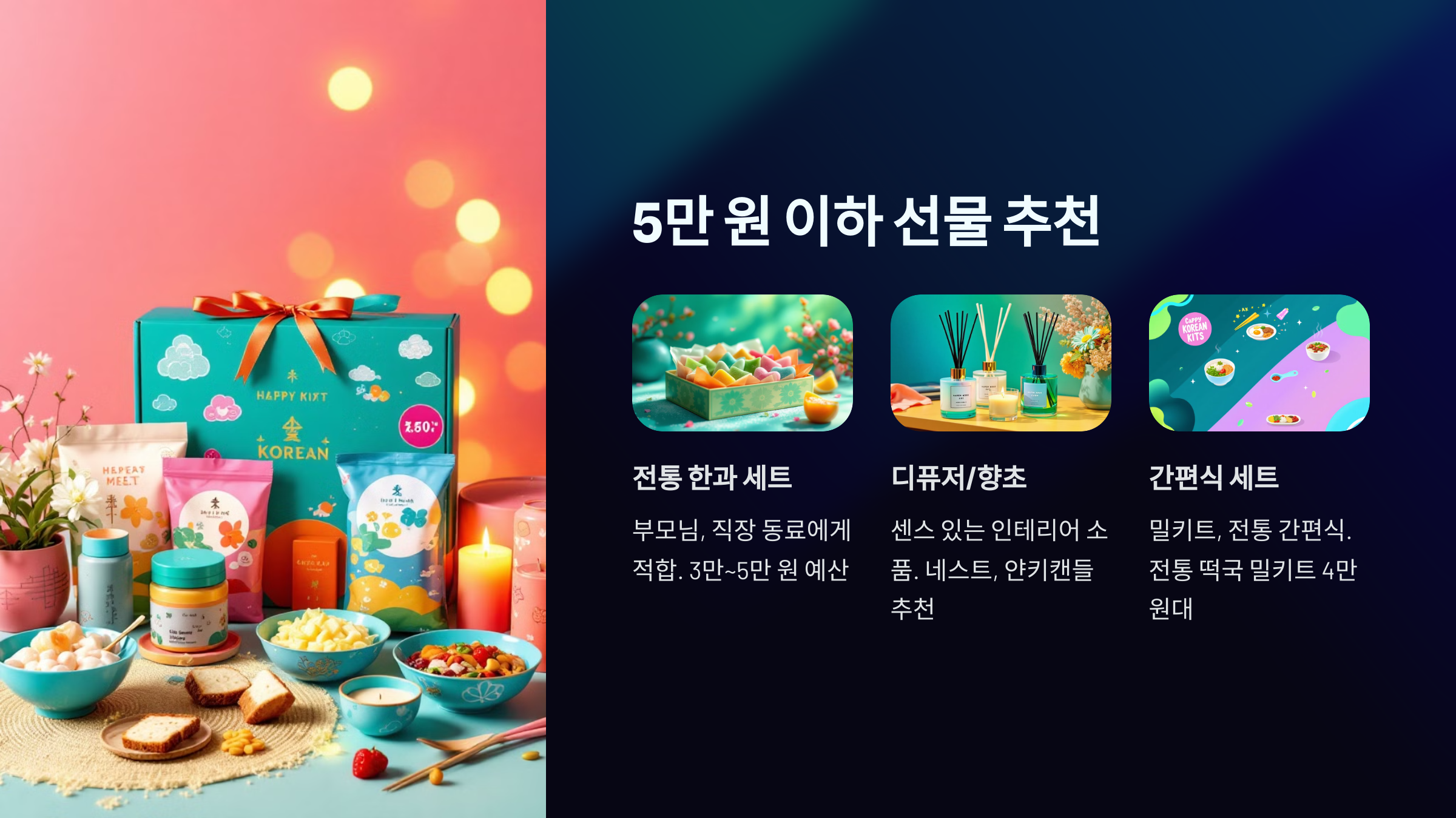 "예산에 맞는 센스 있는 명절 선물로 감사의 마음을 전하세요!"