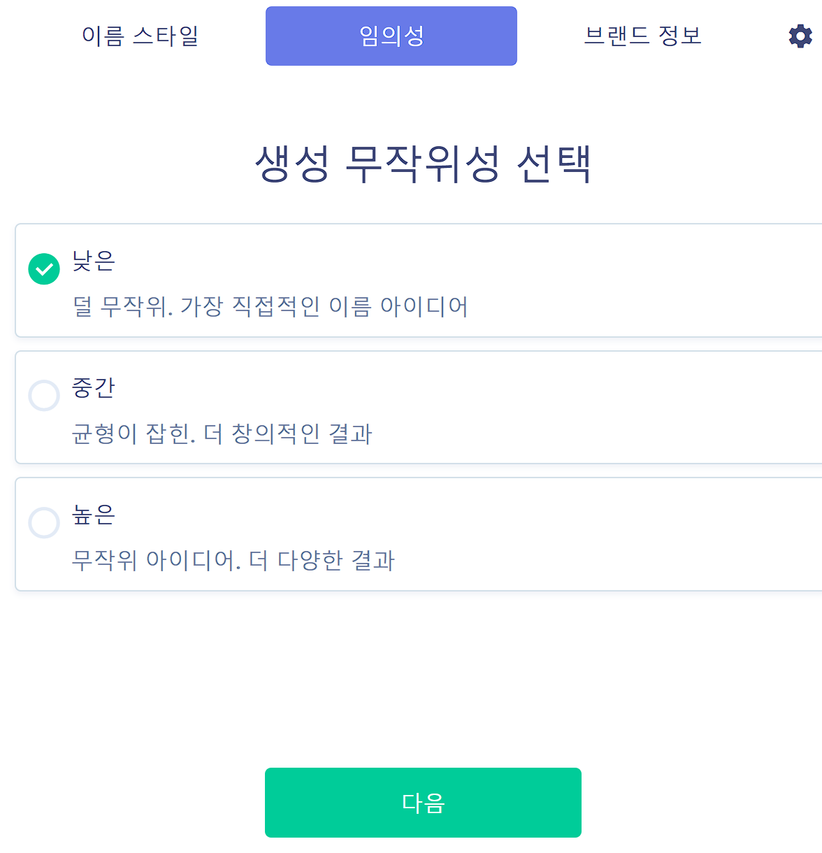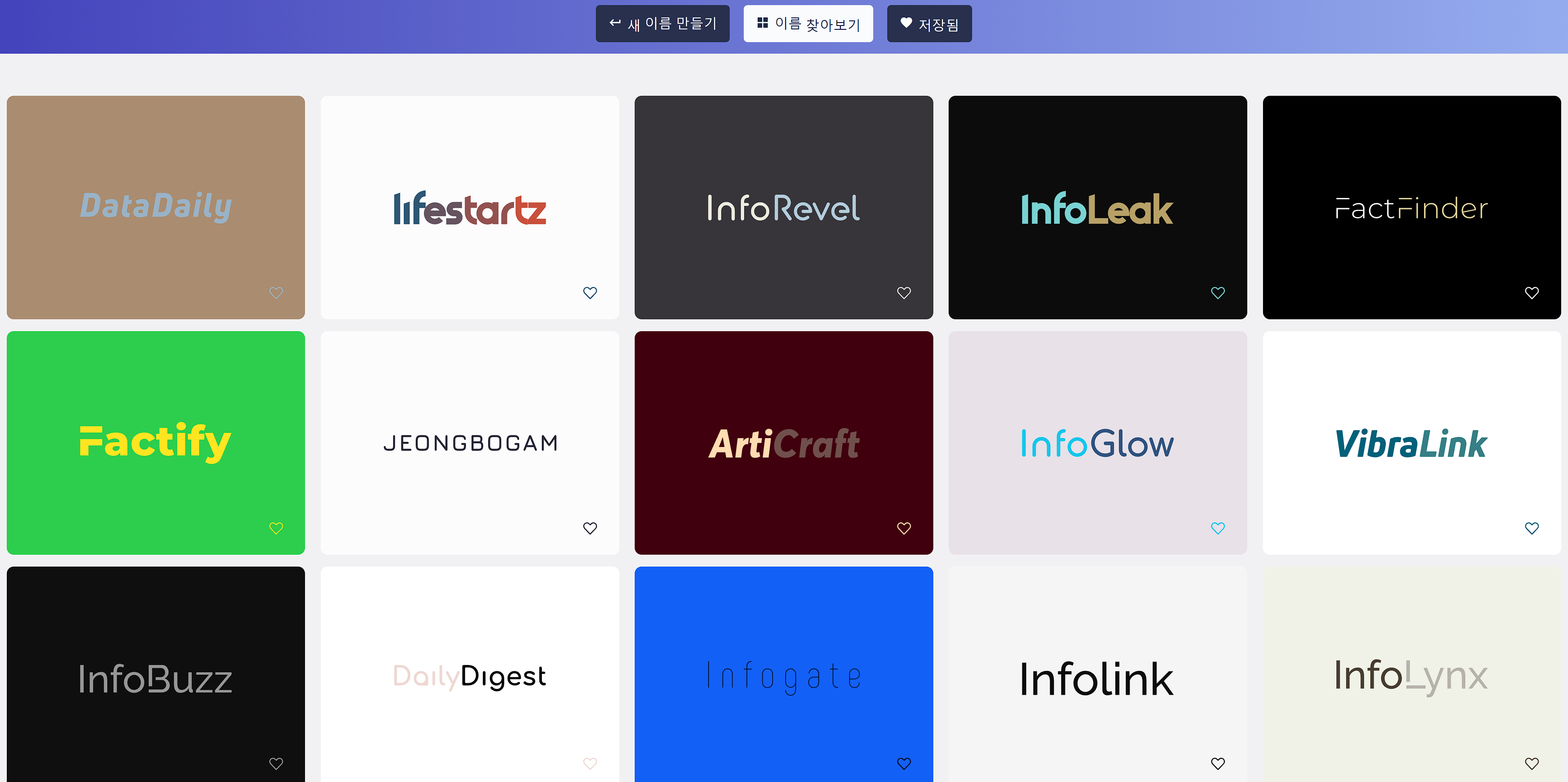 브랜드 이름이 생성되었습니다. 여기에서 원하는 네이밍을 골라서 진행하세요.