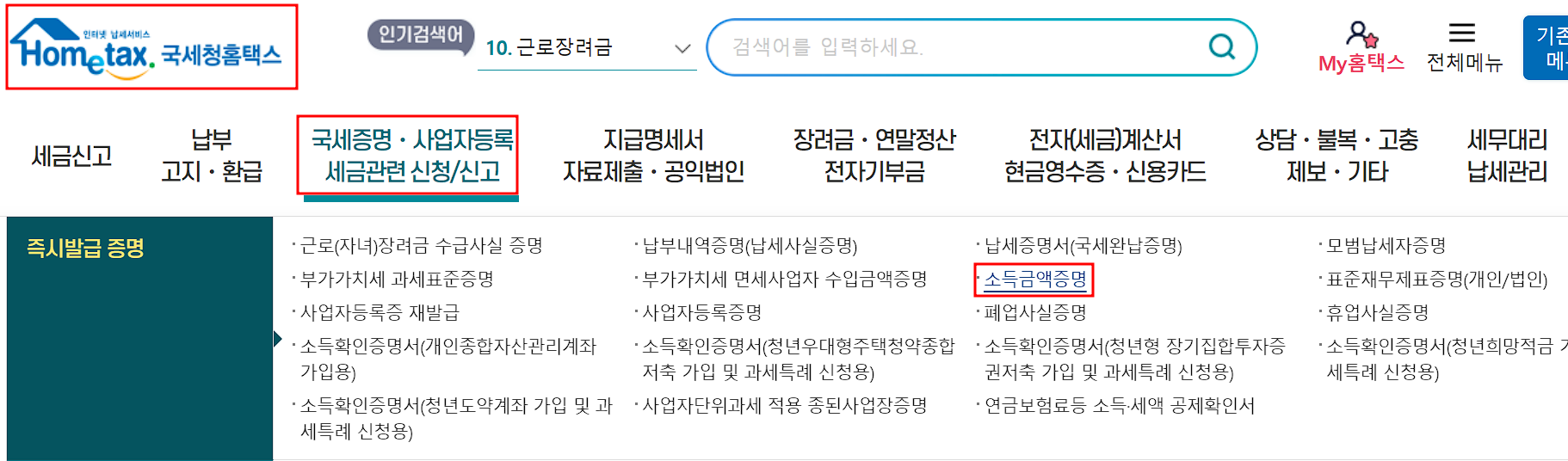 2. 홈택스 사이트의 상단 메뉴 중 국세증명·사업자등록 세금관련 신청/신고에서 소득금액증명을 선택하신 후 로그인을 진행합니다.