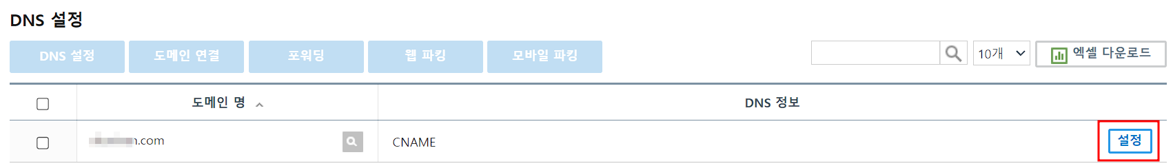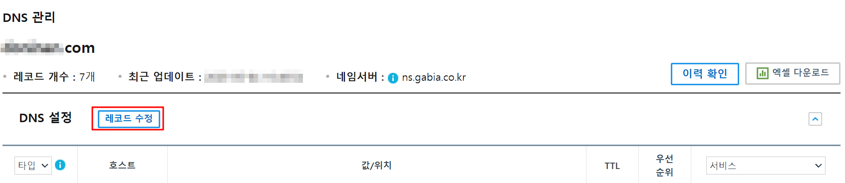 일단 가비아 사이트로 접속하세요. MY가비아>DNS관리툴로 이동하여 본인 도메인의 설정을 클릭합니다.
