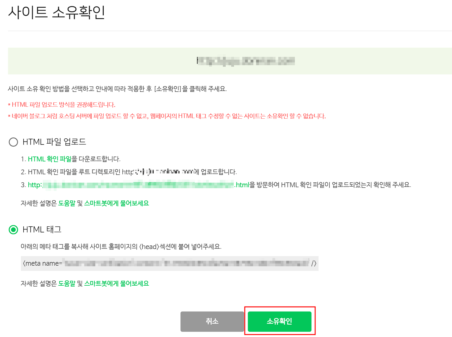 사이트 소유확인이 뜨면 HTML태그를 클릭한 후에 메타 태그를 복사 한 후 본인 티스토리 블로그스킨편집에 html편집의 html으로 들어가서 <head> 밑에 메타 태그를 붙여넣기 해 준 후 적용을 눌러줍니다.