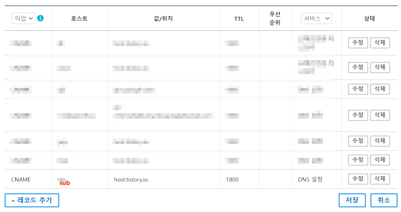하단의 레코드 추가를 누르고 타입에 CNAME, 호스트에 간결한 하위 도메인 주소를 예를 들어 sub를 입력했다고 치고 , 값/위치에 host.tistory.io. 입력, TTL에 1800을 서비스에 DNS 설정을 클릭해주고 수정 저장해 줍니다.