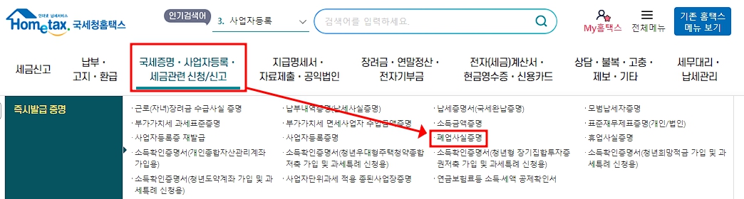 2. 국세증명·사업자등록·세금관련 신청/신고 >즉시발급증명>폐업사실증명 메뉴를 클릭해 줍니다.