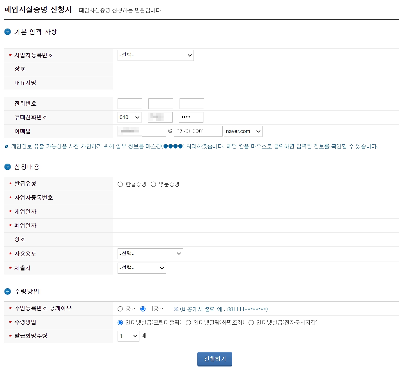 3. 폐업사실증명서에 해당 사업자등록번호를 선택하신 후 용도에 따라 발급유형, 사용용도 및 제출처, 수령방법 등을 체크 후 신청하시면 됩니다.
