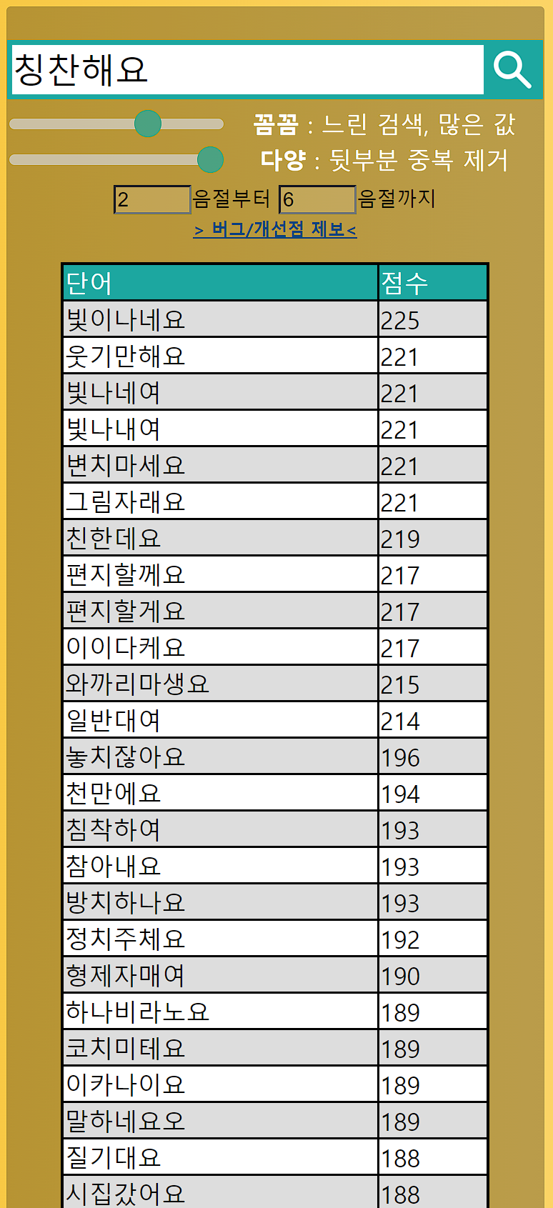맞추고 싶은 라임을 검색합니다. 검색된 단어를 점수순으로 출력하고 대략 200점 정도면 라인이 잘 맞는다고 보시면 됩니다.
