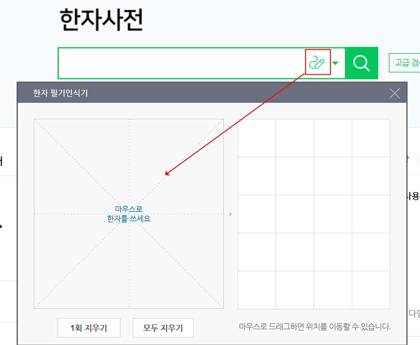 2. 한자 필기인식기를 켜주시고 마우스로 한자를 그리세요.(쓰세요.)