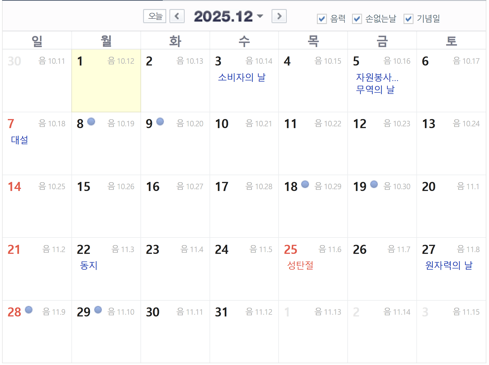 1월1일(수): 신정, 1월 28일(화)~1월 30일(목): 설날 연휴